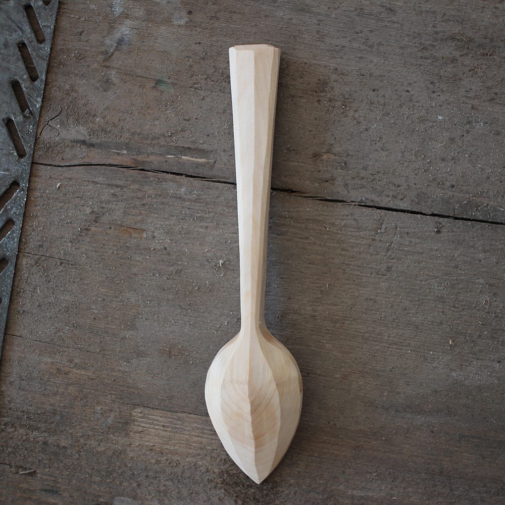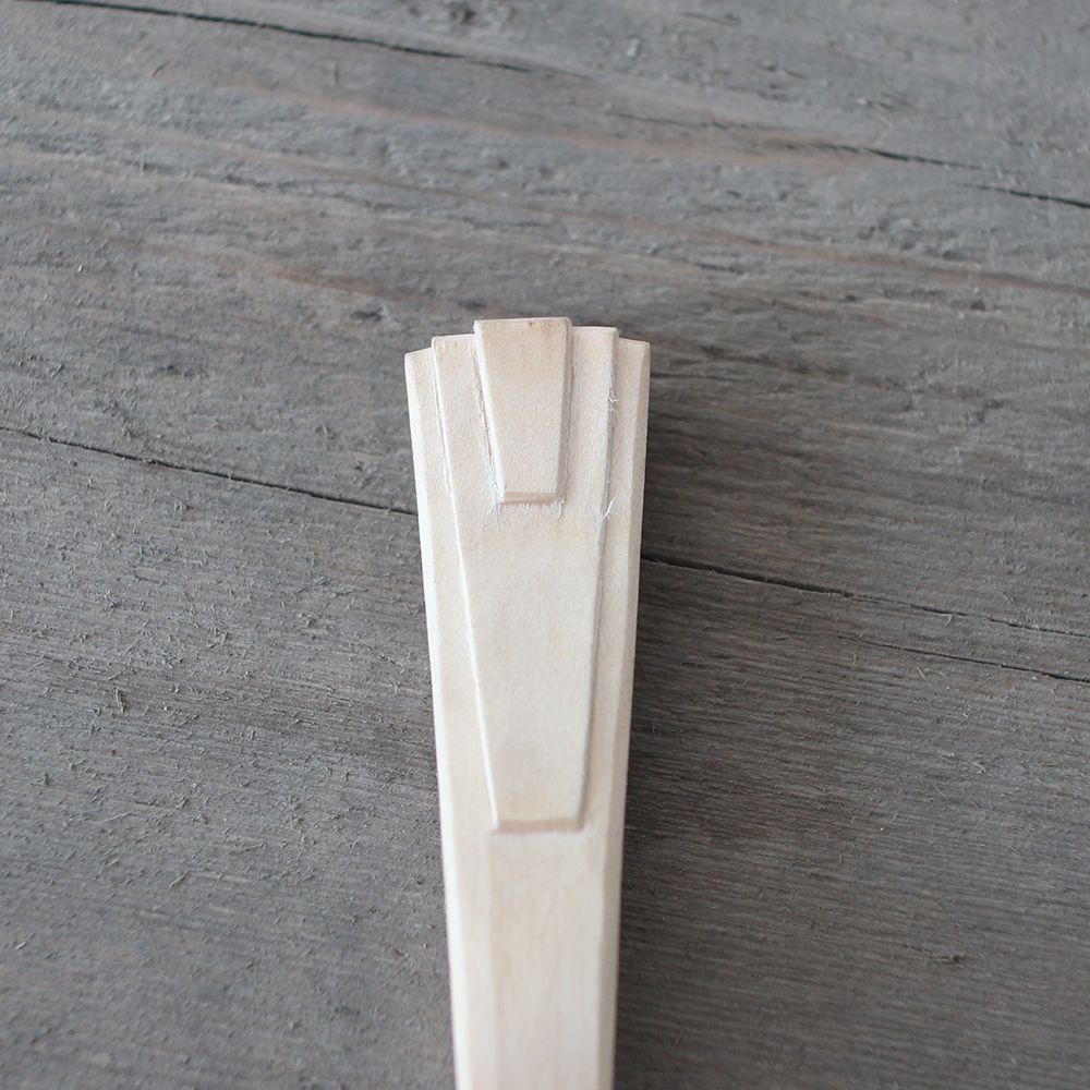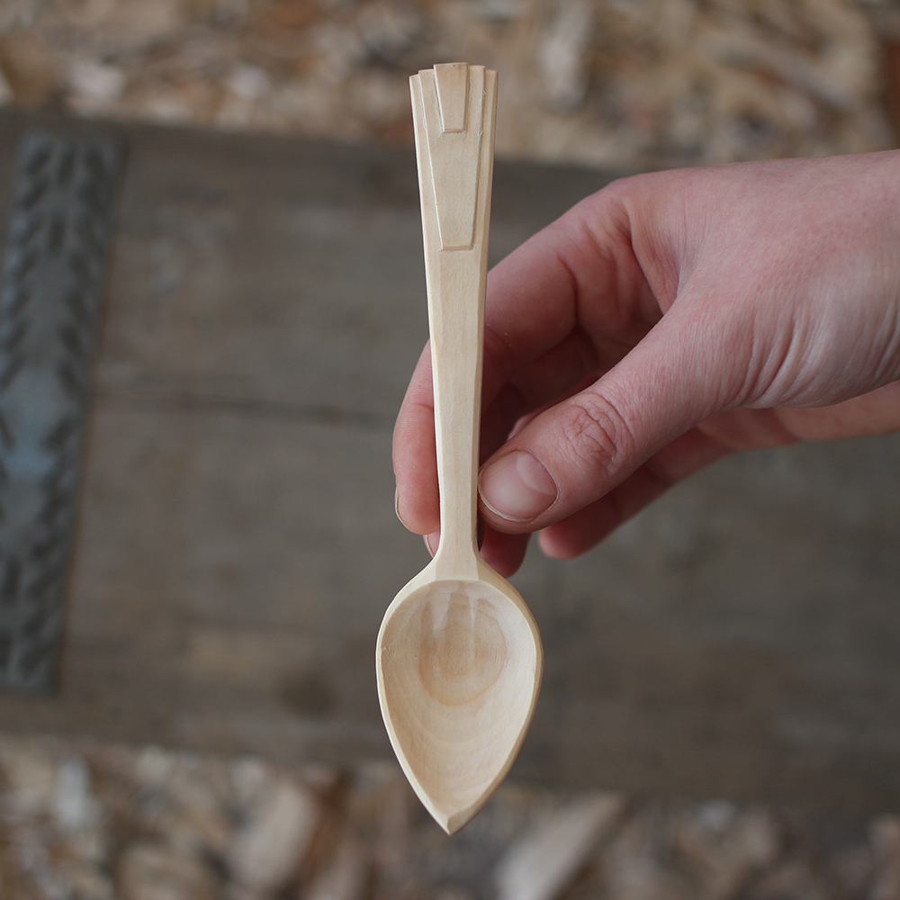 A decorated art deco teaspoon with teardrop shaped bowl. Hand carved surfaces that will grow ever-more beautiful with age. A unique, numbered piece.