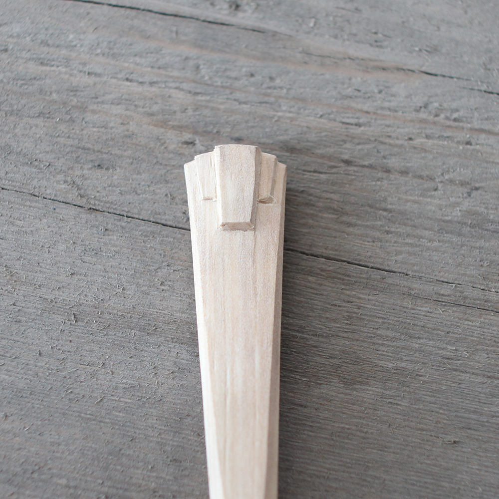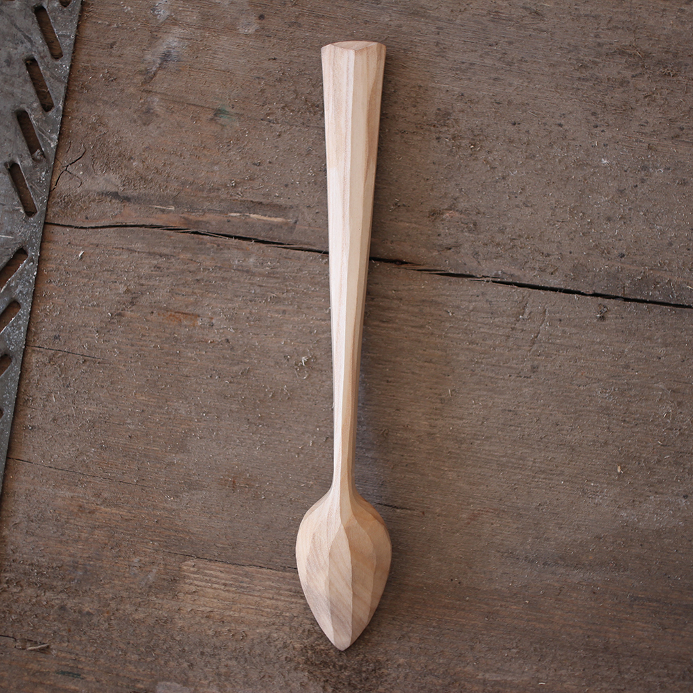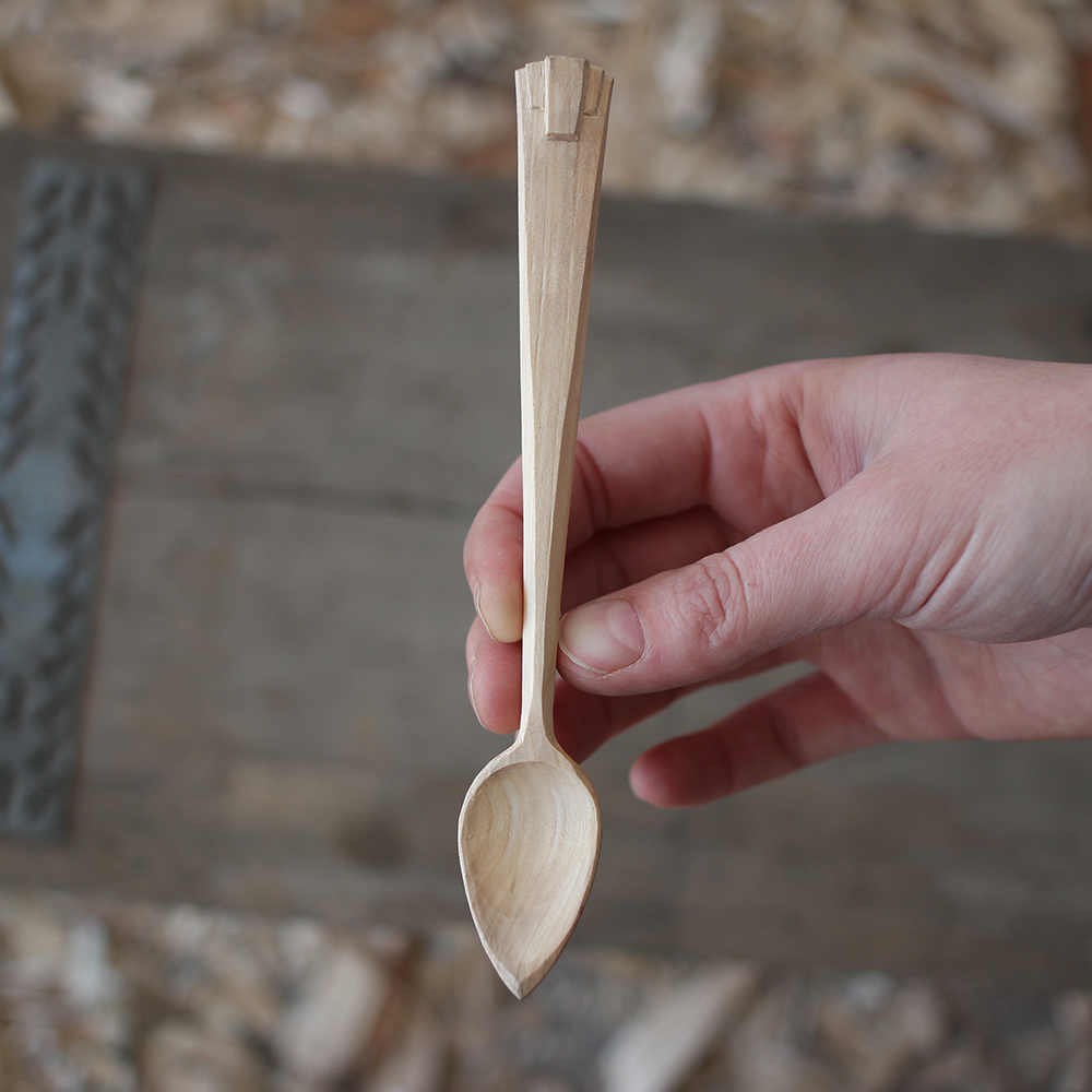 A decorated art deco teaspoon with teardrop shaped bowl. Hand carved surfaces that will grow ever-more beautiful with age. A unique, numbered piece.