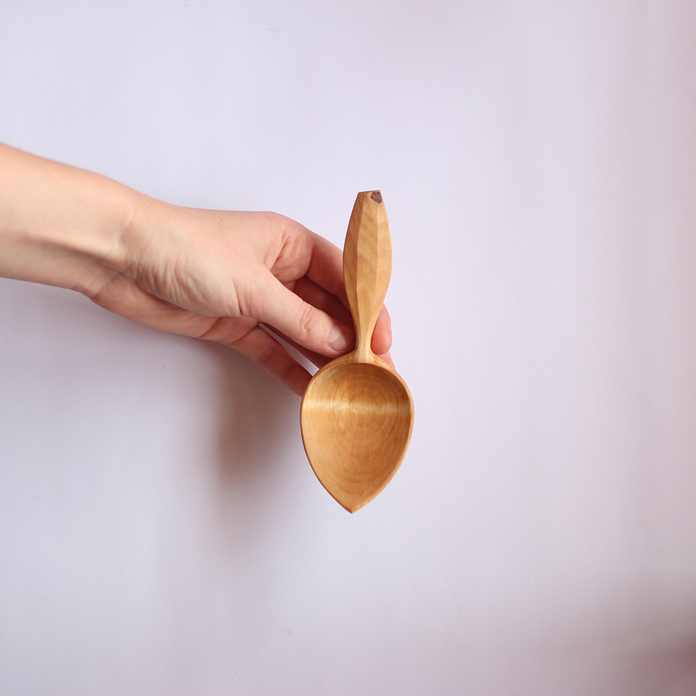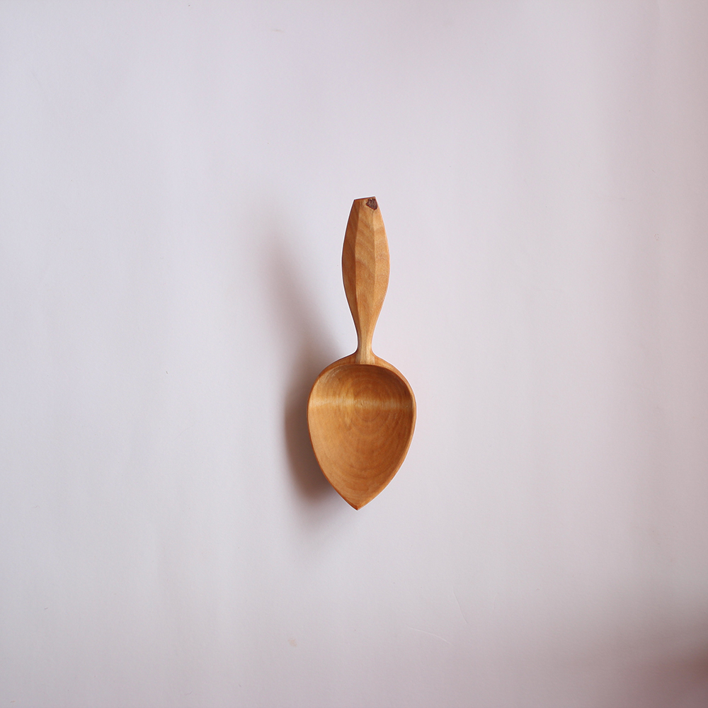 This special little spoon is dear to me. The facets down the top surface of the handle create a ripple in the grain, while the short size?creates gorgeous curves.